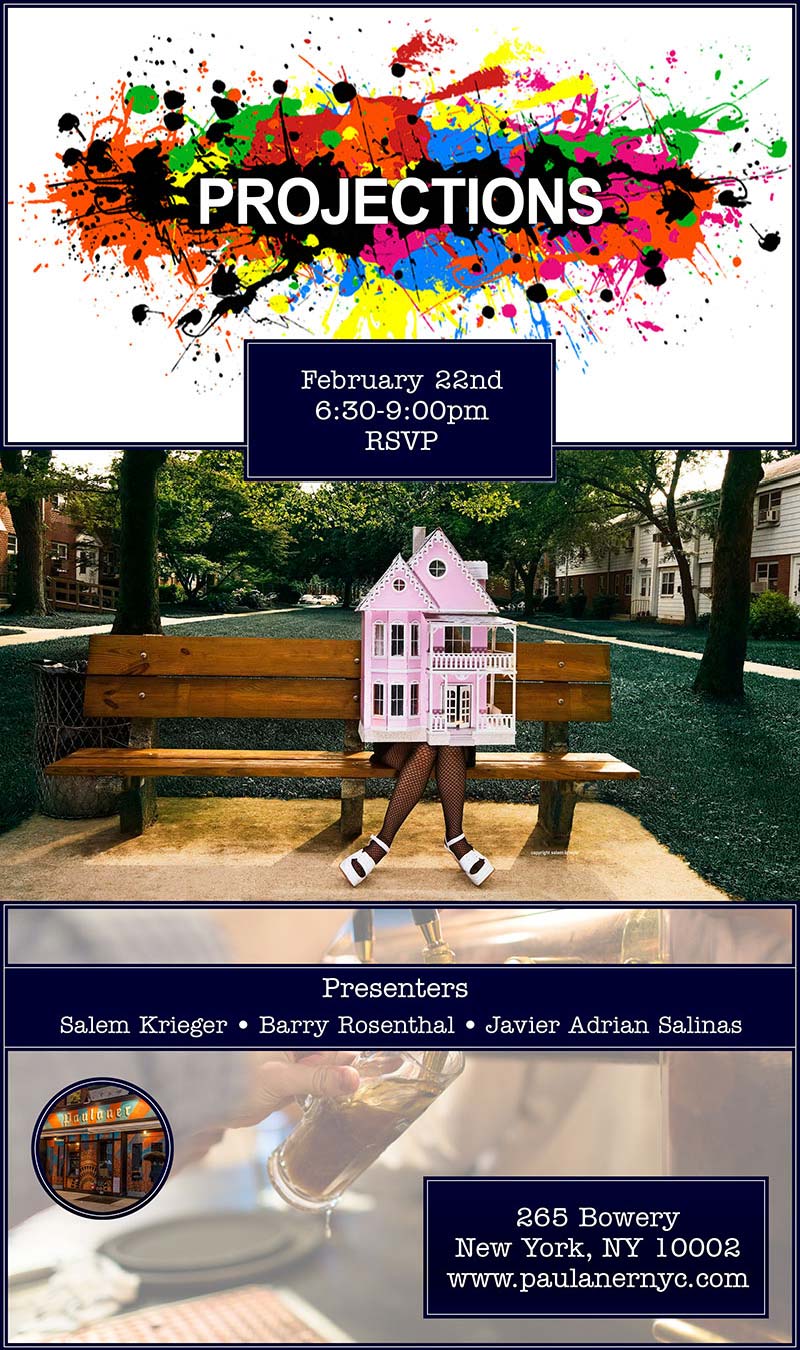 Projections will be on January 22, 2017 from 6:30-9:00pm at Paulaneer – 265 Bowery – New York, NY 10002. Joining us will be Salem Krieger, Barry Rosenthal and Javier Adrian Salinas.